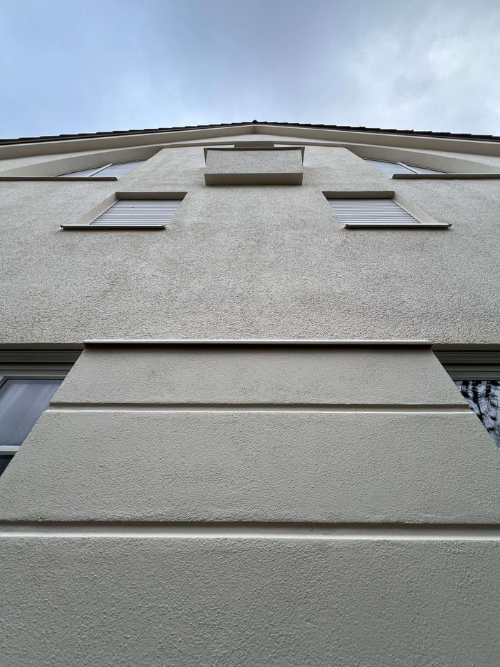Materialqualität durch STO: Als hochwertige Oberfläche kam StoColor Silco G, eine echte Silikonharz-Fassadenfarbe mit erhöhtem, verkapseltem Filmschutz, zum Einsatz. Sie ist extrem wasserabweisend, strukturerhaltend, sehr gut deckend, robust und mindert Verschmutzungsneigung deutlich. Dank guter CO₂- und Wasserdampfdurchlässigkeit sorgt sie für dauerhaften Schutz bei gleichbleibender Optik